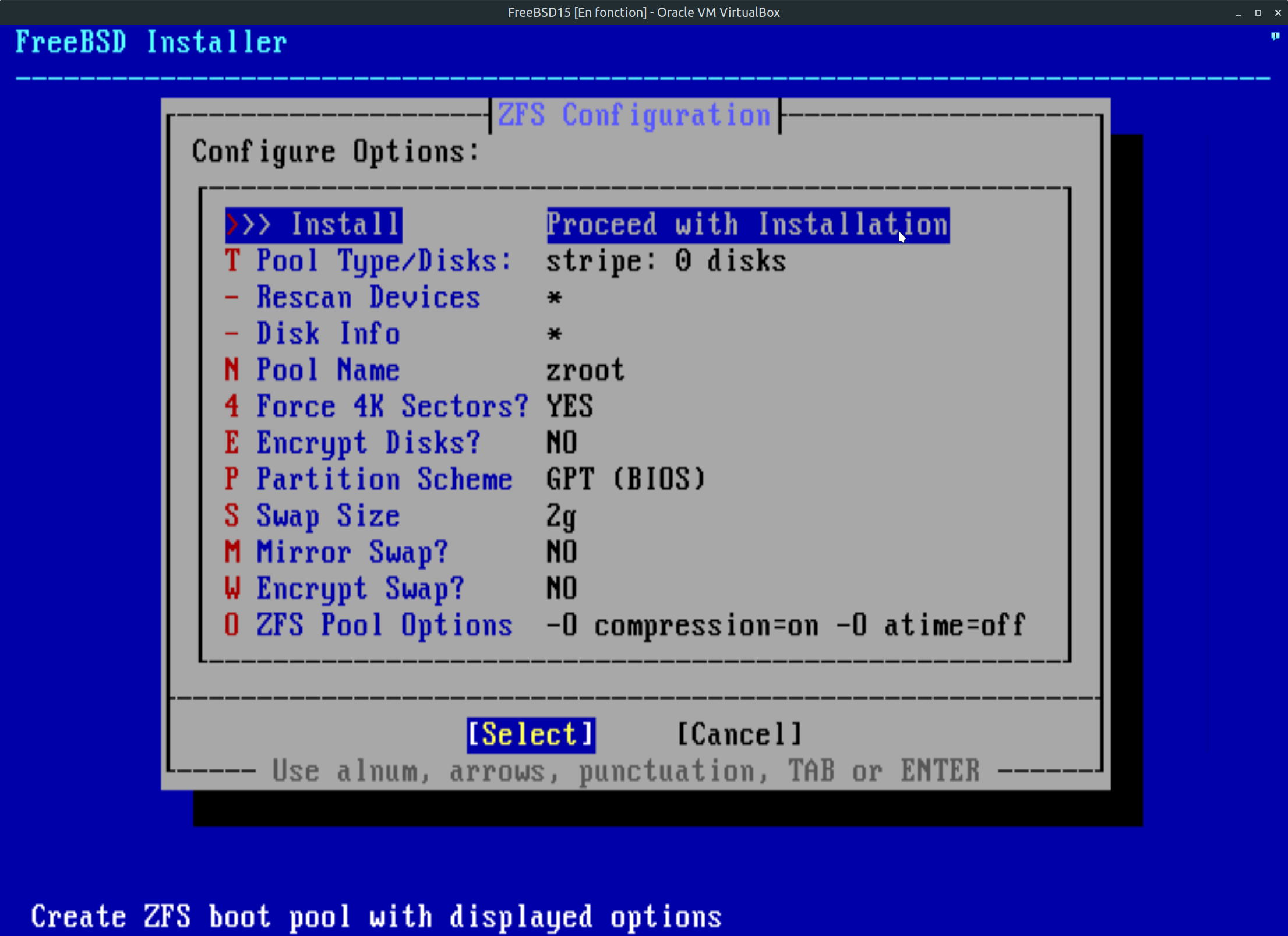 Étape 13: Maintenant que l'on a choisi le système de fichier du disque ZFS et la configuration par défaut, il vous reste à indiquer sur quel disque voulez-vous utiliser pour l'installation. Dans mon cas, j'ai un seul disque alors le choix est facile. Advenant le cas où vous avez 2,3 disque dur sur le PC, vous devez simplement vous positionner sur le disque que vous voulez utiliser. Utiliser la touche espace du clavier pour faire la sélection et faite entrée pour valider le choix.