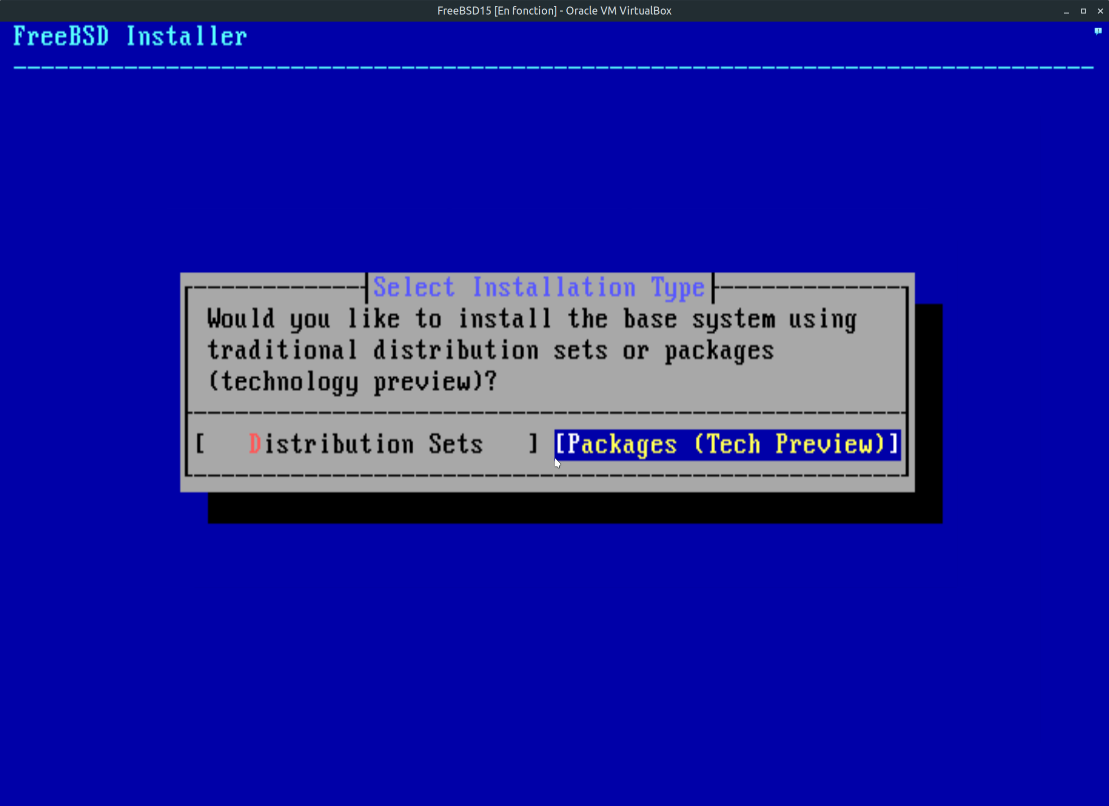 Étape 7: Nous voici rendu à l'étape de l'installation des paquets (ensemble de fichier système et logiciel de base du système). Comparativement au version précédente de FreeBSD, Nous avons ici une nouveauté sur le processus d'installation. Il est préférable de sélectionner à l'aide des flèches gauche droite du clavier, packages tech preview. Si vous sélectionner cette option, assurez-vous que votre connexion internet sera bien configurer dans les prochaines étapes et fonctionnelles. Dans les deux cas, le système sera installé avec tous les composants. Mais il est préférable de prendre le choix par défaut. Après avoir opté pour le bon choix, faite entrée au clavier.