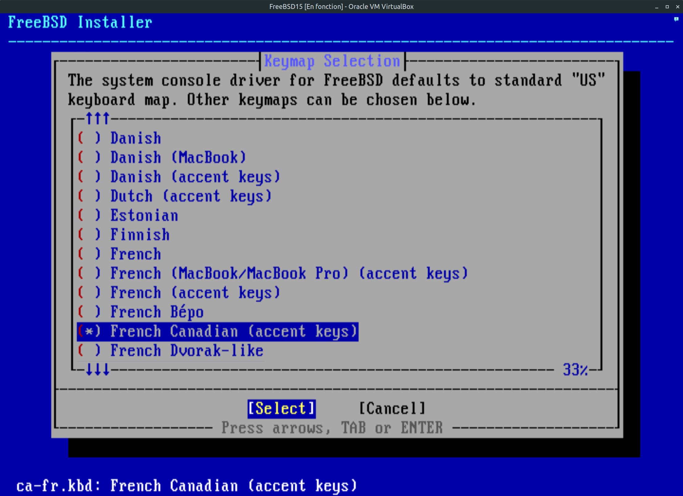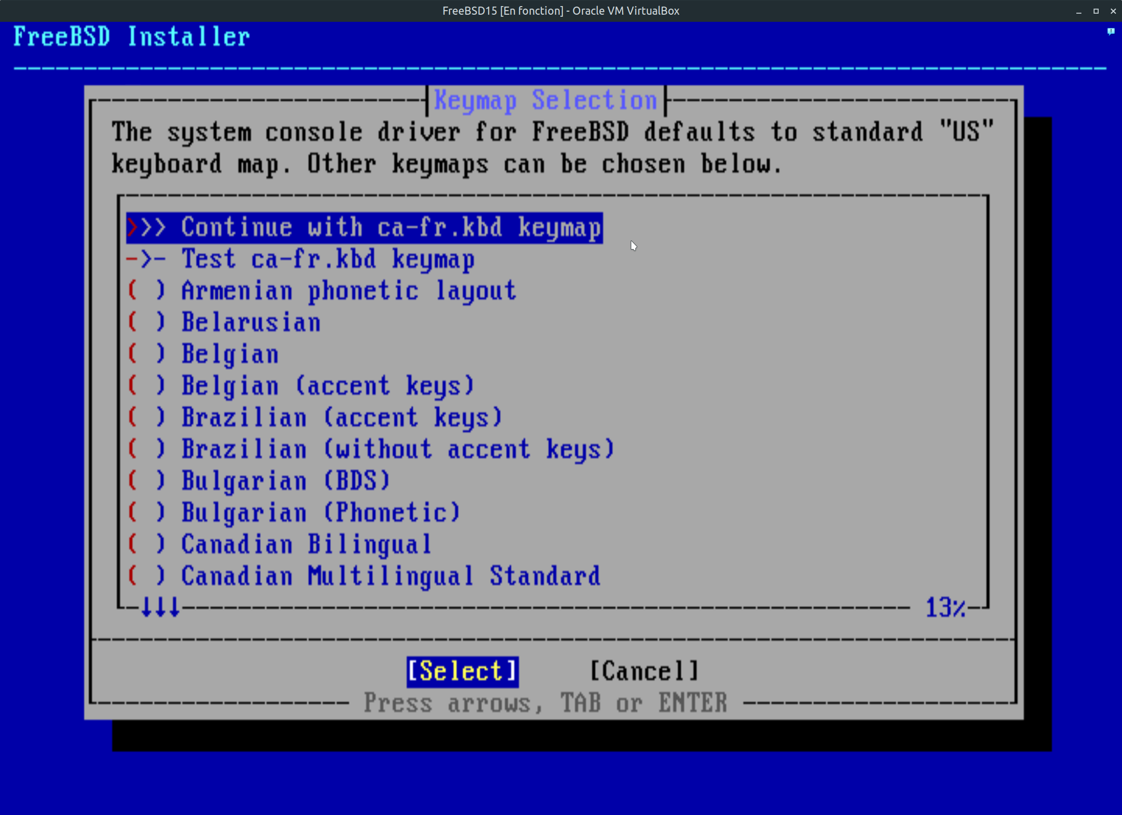 Étape 5: À ce stade, vous avez valider et tester votre choix. Positionner vous sur continuer avec ca-fr.kbd keymap et faite entrée au clavier afin de poursuivre l'installation.