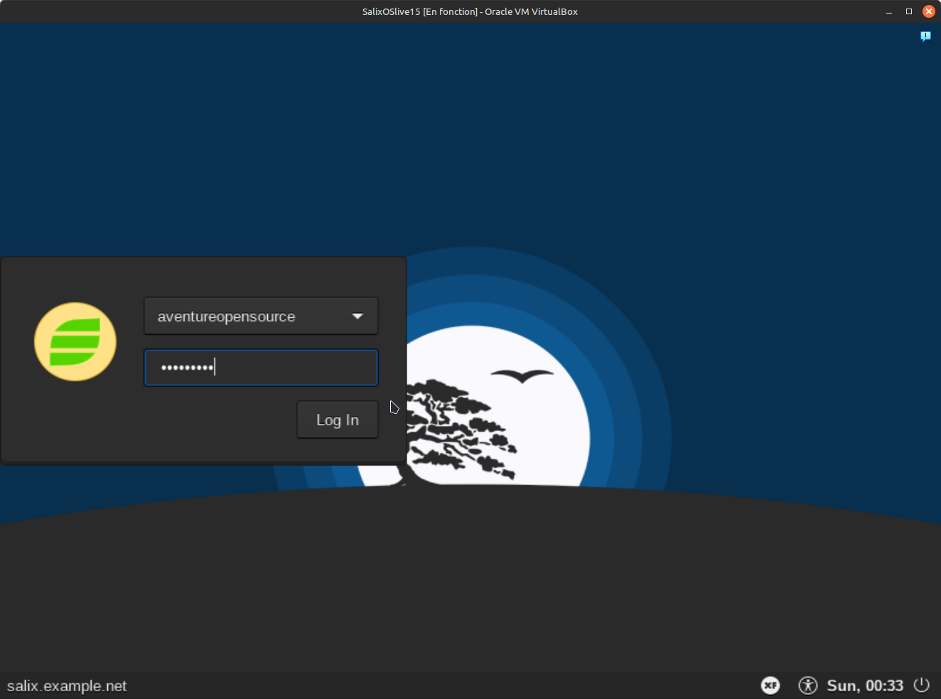 14. Votre système a démarrer correctement, alors vous vous retrouver sur l'écran de connexion. Entre votre nom d'utilisateur qui normalement devrait apparaître automatiquement dans la première case. Ne vous reste qu'à entrer votre mot de passe dans la case du bas.