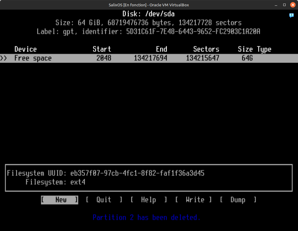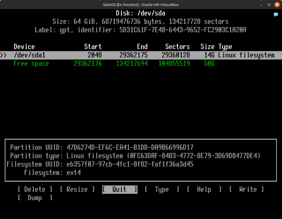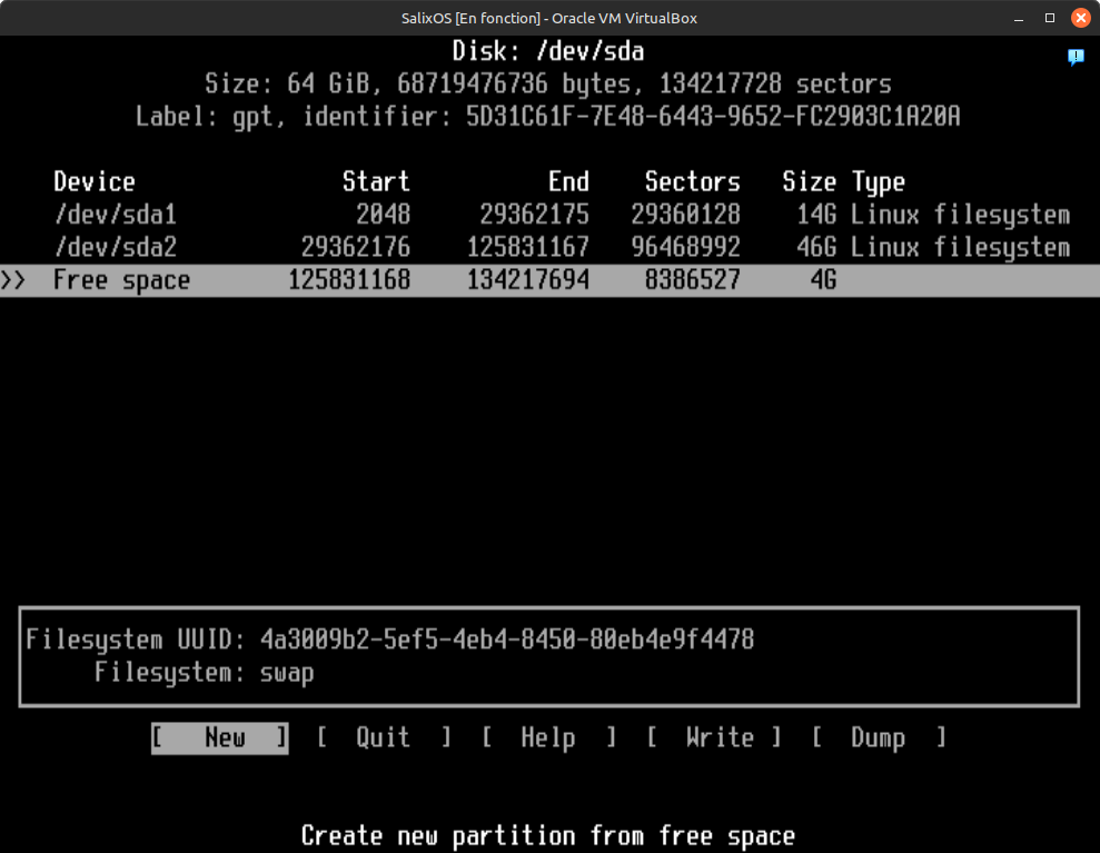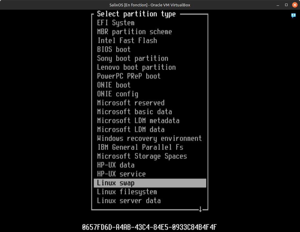 13. Nous voici à la création de la dernière partition qui sera cette-fois celle de la partition d’échange swap. Positionnez-vous sur l’espace Free du disque et faite "enter"  ensuite allez à l'aide du clavier dans le menu sur "Type" et la fenêtre contextuelle va apparaître et rechercher "linux swap" puis faite "enter"