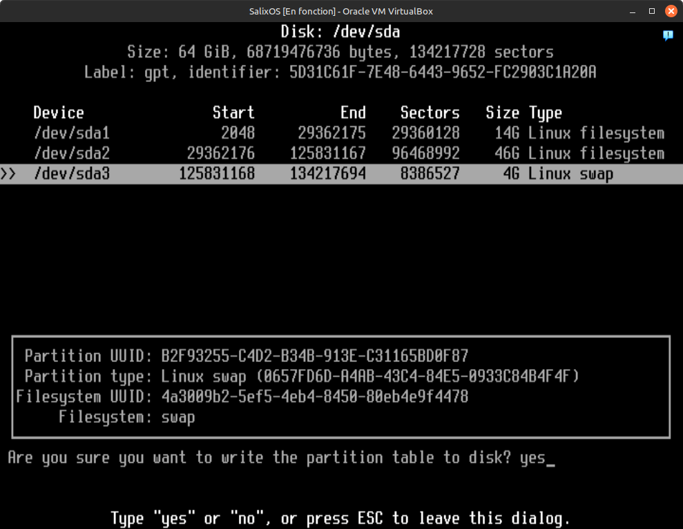 14. Nous avons enfin terminé le partitionnement du disque dur.  Avant de quitter, vous devez écrire sur le disque vos partitions finales. Positionnnez vous sur "Write" et faite "enter" ensuite vous devez mentionner "yes" image 2 afin que le programme d’installation procède au formatage final. Une fois cette étape complétée, vous pouvez quitter en vous positionnant sur "Quit" image 3.
