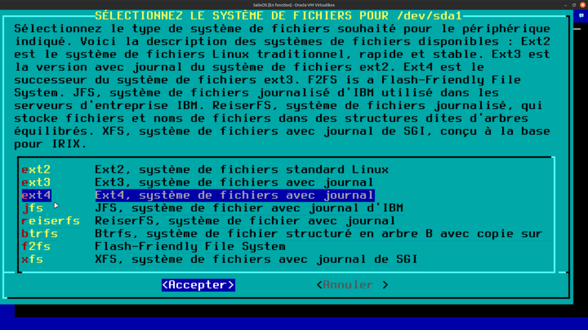 22. Nous voici à la fenêtre de sélection du système de fichier de formatage souhaité, sélectionner EXT4 et faite "entrée" sur le clavier