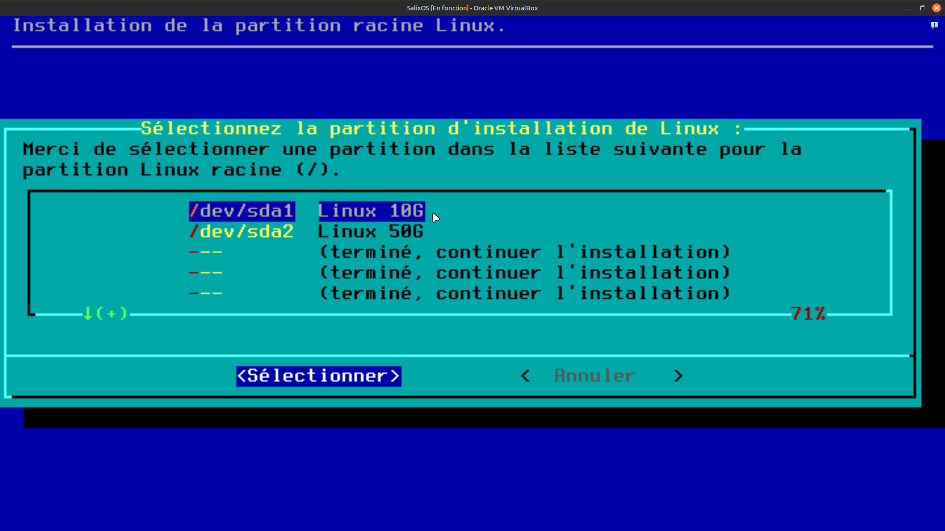 18. Nous voici à l’étape du choix de la partition racine, dans votre cas cette partition aura 50 g minimum. Dans mon cas, sur la machine virtuelle je vais sélectionner la première dans les 2 choix