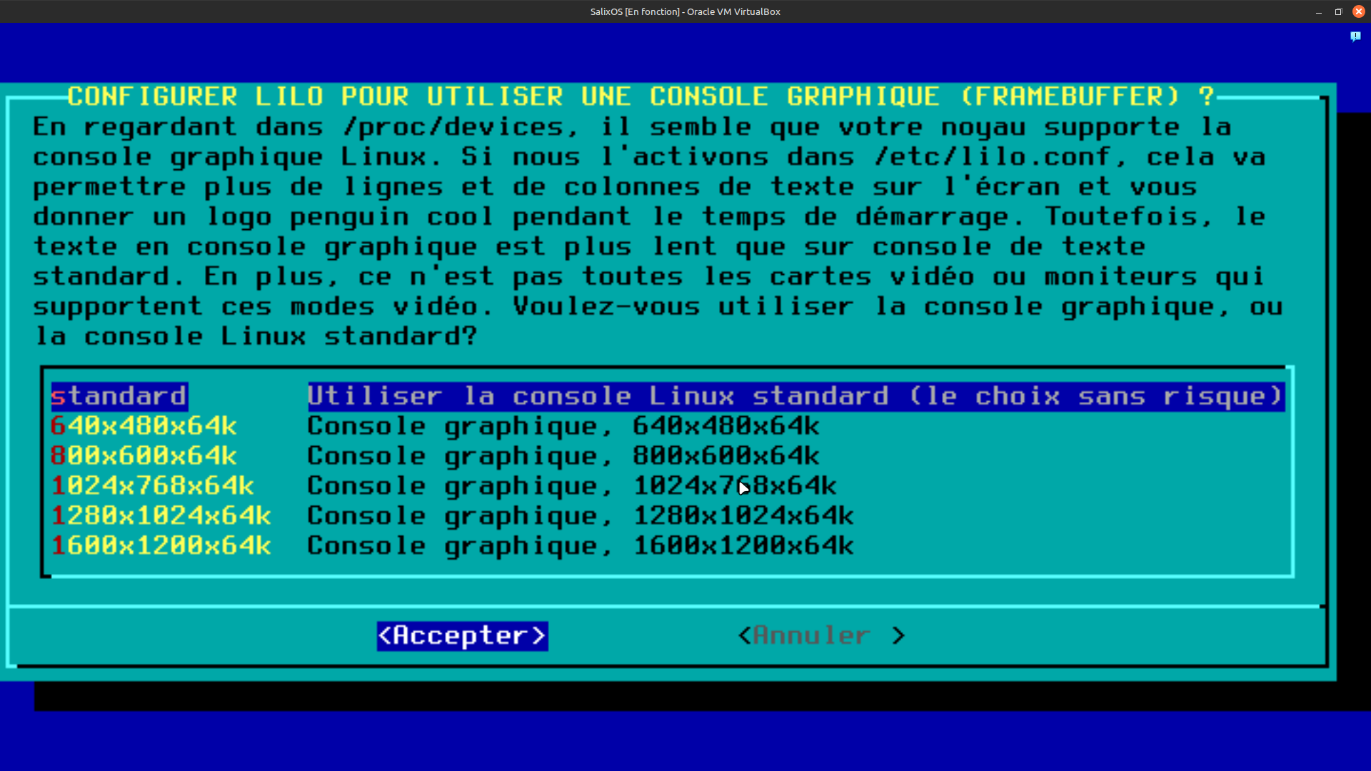 30. Nous sommes sur la fenêtre de dialogue suivante qui vous demande la résolution de l’écran  pour le chargeur d’amorçage. Laisser le choix par défaut et faite "entrée" sur votre clavier