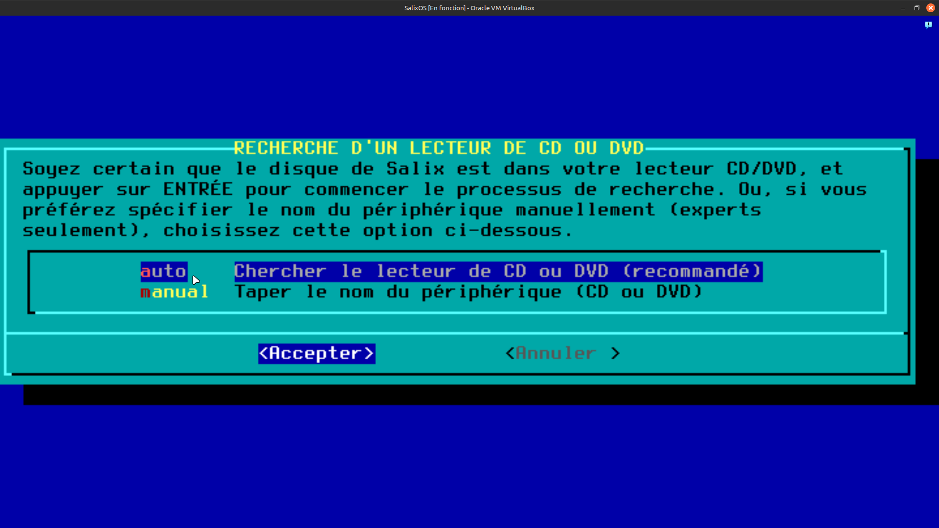 25. Cette étape consiste à sélectionner le média d’installation. Dans votre cas, ce sera certainement par clé usb. Dans mon cas en mode virtuel, je dois sélectionner CD ou DVD pour lancer la procédure