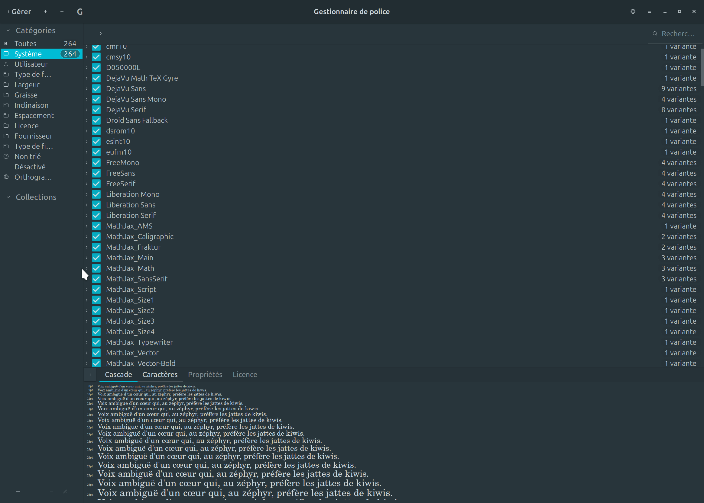 4. Le programme est lancé, l'interface est très simple et épuré. Sur la fenêtre d'acceuil, Font-manager est ouvert immédiatement sur la gestion des polices du système. Dans l'image ci-dessous, vous avez sur le côté gauche les catégories de police. En général, on retrouve l'information sur le nombre de polices préinstallées du système au nombre de 264 sur LinuxMint. Ce que la plupart d'entre vous diront, c'est amplement suffisant non! Mais pour d'autres, dont les graphistes, eux désirent avoir plus de polices différentes et artistiques. Sur la droite, vous avez la liste des polices par leur nom. Lorsque vous faite un clique sur une police dans la liste de droite, dans la section du bas, vous avez un défillement de la police sous différente grandeur. Ce qui vous permet de prévisualiser l'effet. N'est-ce pas merveilleux!