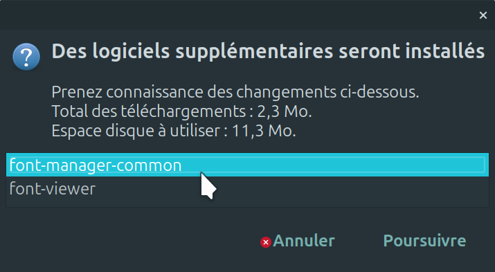 2. Une fois le logiciel Font-manager trouvé, vous avez simplement qu'à faire un clique sur installer. Lors de l'installation, une fenêtre supplémentaire apparaît afin de vous informer que des paquets supplémentaires seront installation. Juste à faire un clique sur * Poursuivre *. Une fois fait, le processus d'installation est en route (image3).