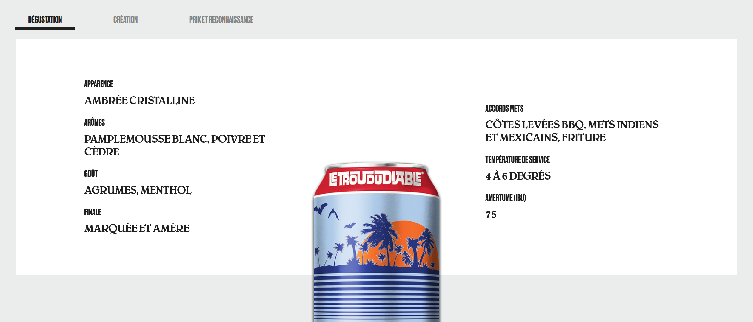 Une bière ambrée et cristalline au nez rafraîchissant de pamplemousse blanc, de cèdre et de poivre long. La bouche, désaltérante, est le reflet de ce profil auquel s’ajoute d’agréables notes de citron et de menthol. La finale, bien marquée des houblons américains et australiens, s’étale sur le palais comme le roi des vacanciers sous le soleil des tropiques.