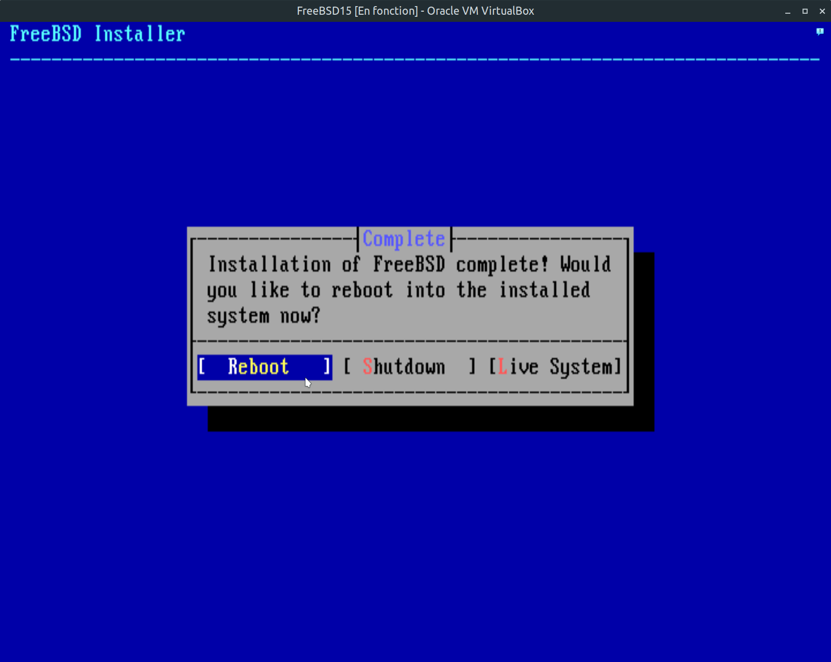 Étape 28: Voilà c'est terminé pour le processus d'installation. Félicitation vous avez réussi ! Mais nous avons pas terminer. Faite entrée au clavier pour redémarrer votre système. Il nous reste encore quelques étapes post-installations afin de rendre FreeBSD utilisable comme un ordinateur de bureau.