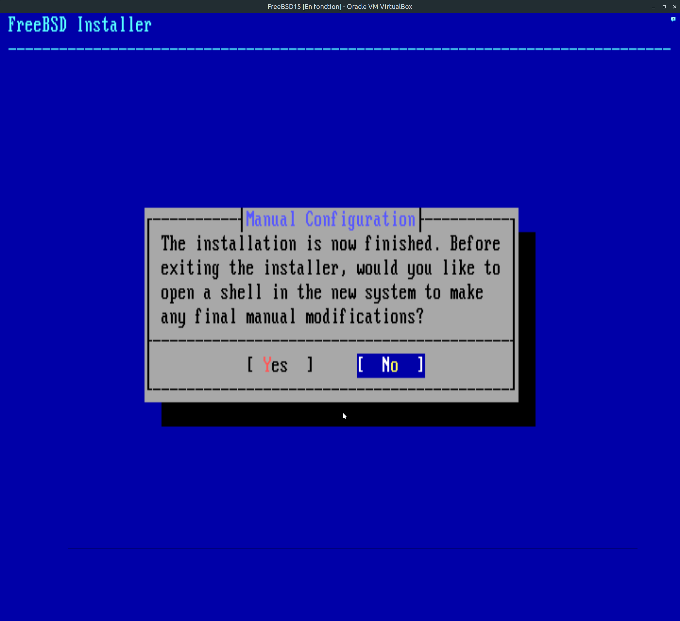 Étape 27: L'installateur de FreeBSD est tellement bien fait, qui vous donne encore la chance de revenir en arrière avec cette fenêtre contextuelle. Vous n'avez qu'à vous placer sur No et faire entrée au clavier pour valider