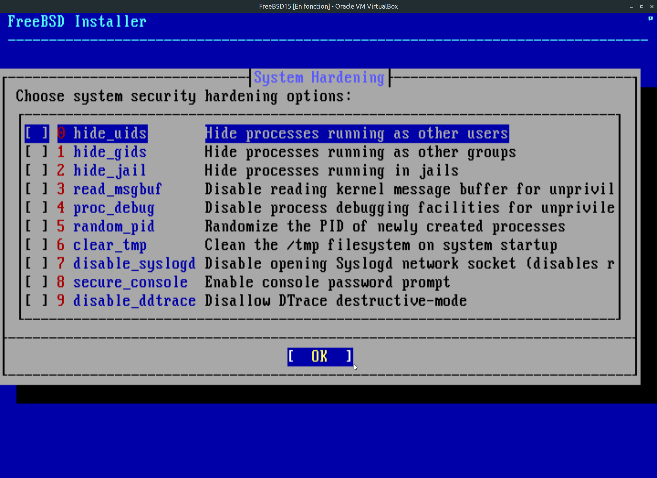 Étape 23: FreeBSD vous offre un grand choix d'option de sécurité lors du processus d'installation. Ces choix s'adressent surtout au utilisateur avancé. Laisser le choix par défaut et faite entrée au clavier pour passer aux étapes suivantes.