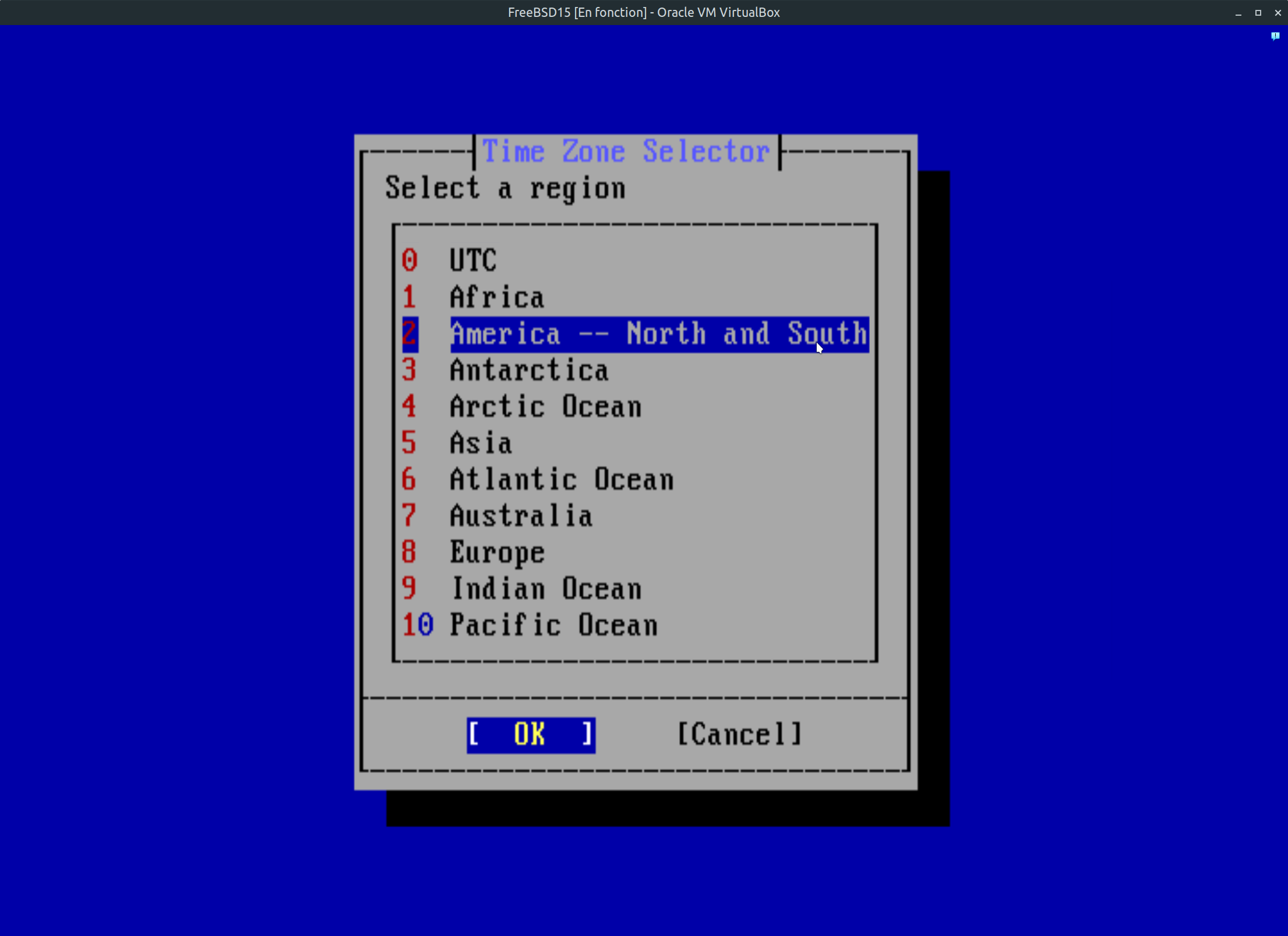 Étape 18: Votre disque a été configuré, l'installation des paquets (fichier système et logiciel) est faite. Le compte (root) est configuré, maintenant nous sommes à l'étape de votre situation géographique. Ce qui détermine l'heure du fuseau horaire pour le système. Alors dans notre cas, a l'aide des fléches du clavier, je me positionne sur Amerique — Nord et Sud. Faite entrée sur le clavier pour valider.