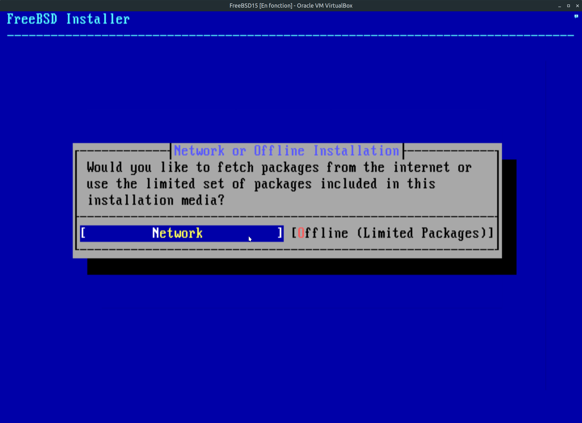 Étape 7: Nous voici rendu à l'étape de l'installation des paquets (ensemble de fichier système et logiciel de base du système). Comparativement au version précédente de FreeBSD, Nous avons ici une nouveauté sur le processus d'installation. Il est préférable de sélectionner à l'aide des flèches gauche droite du clavier, packages tech preview. Si vous sélectionner cette option, assurez-vous que votre connexion internet sera bien configurer dans les prochaines étapes et fonctionnelles. Dans les deux cas, le système sera installé avec tous les composants. Mais il est préférable de prendre le choix par défaut. Après avoir opté pour le bon choix, faite entrée au clavier.