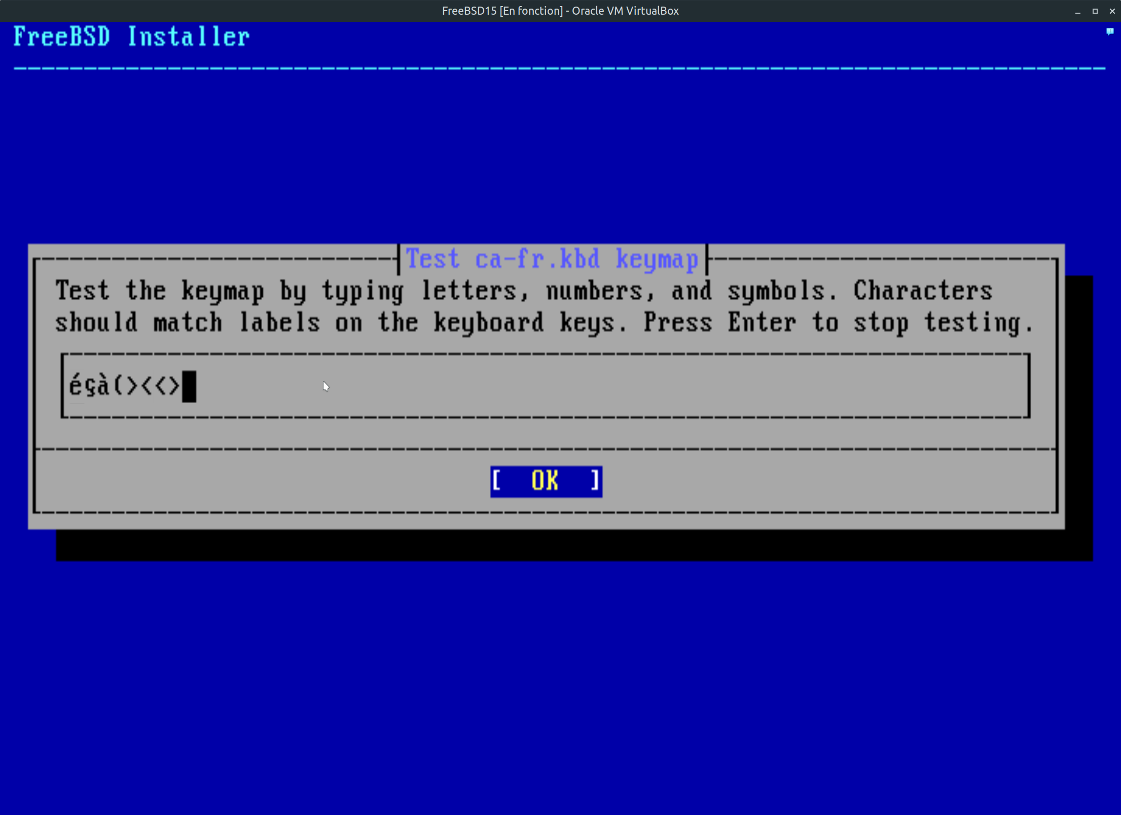 Étape 5: À ce stade, vous avez valider et tester votre choix. Positionner vous sur continuer avec ca-fr.kbd keymap et faite entrée au clavier afin de poursuivre l'installation.