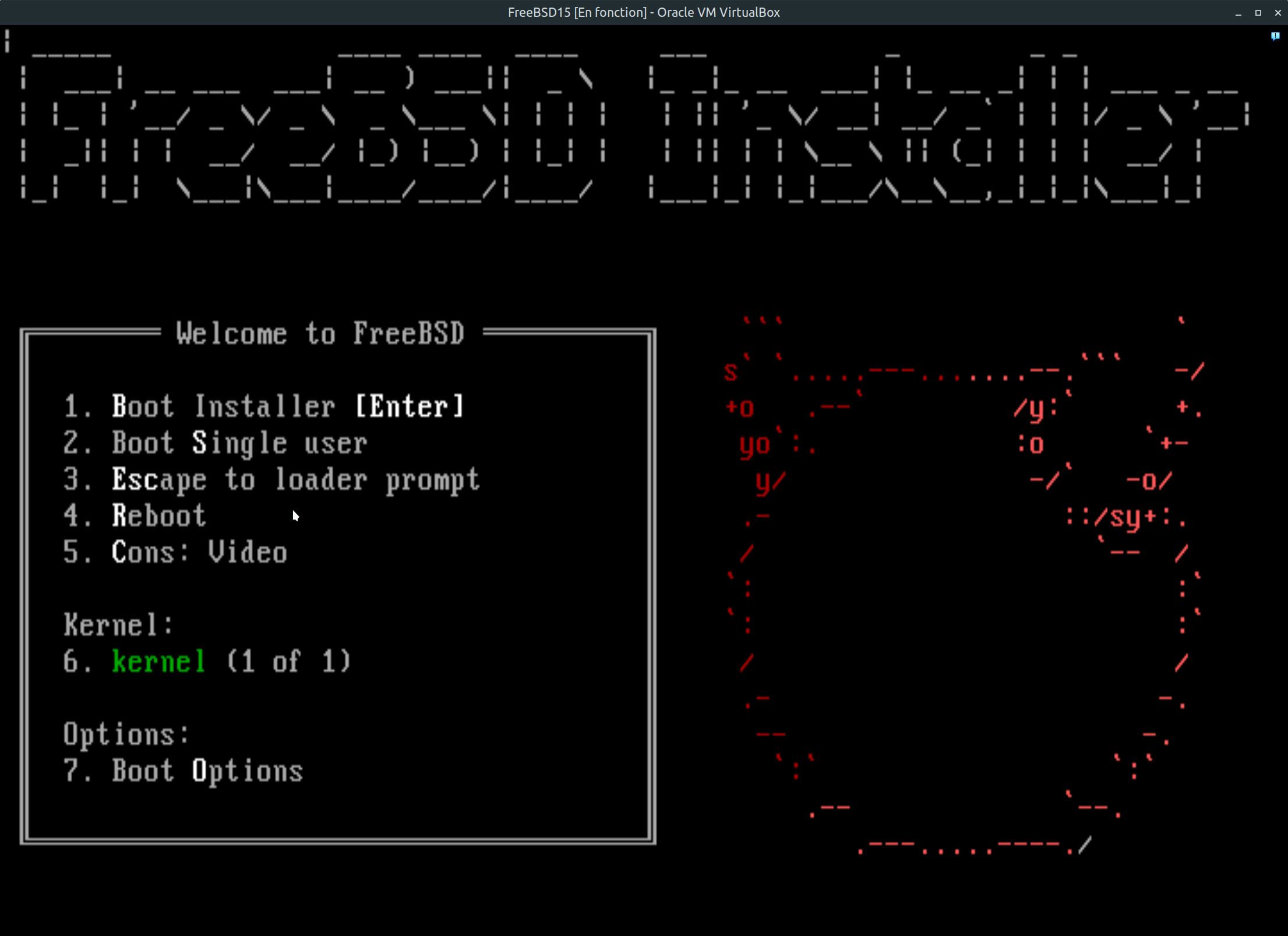 Si tout ce passe bien, vous devriez atteindre le premier écran FreeBSD avec le logo sur lequel vous n'avez qu'à faire