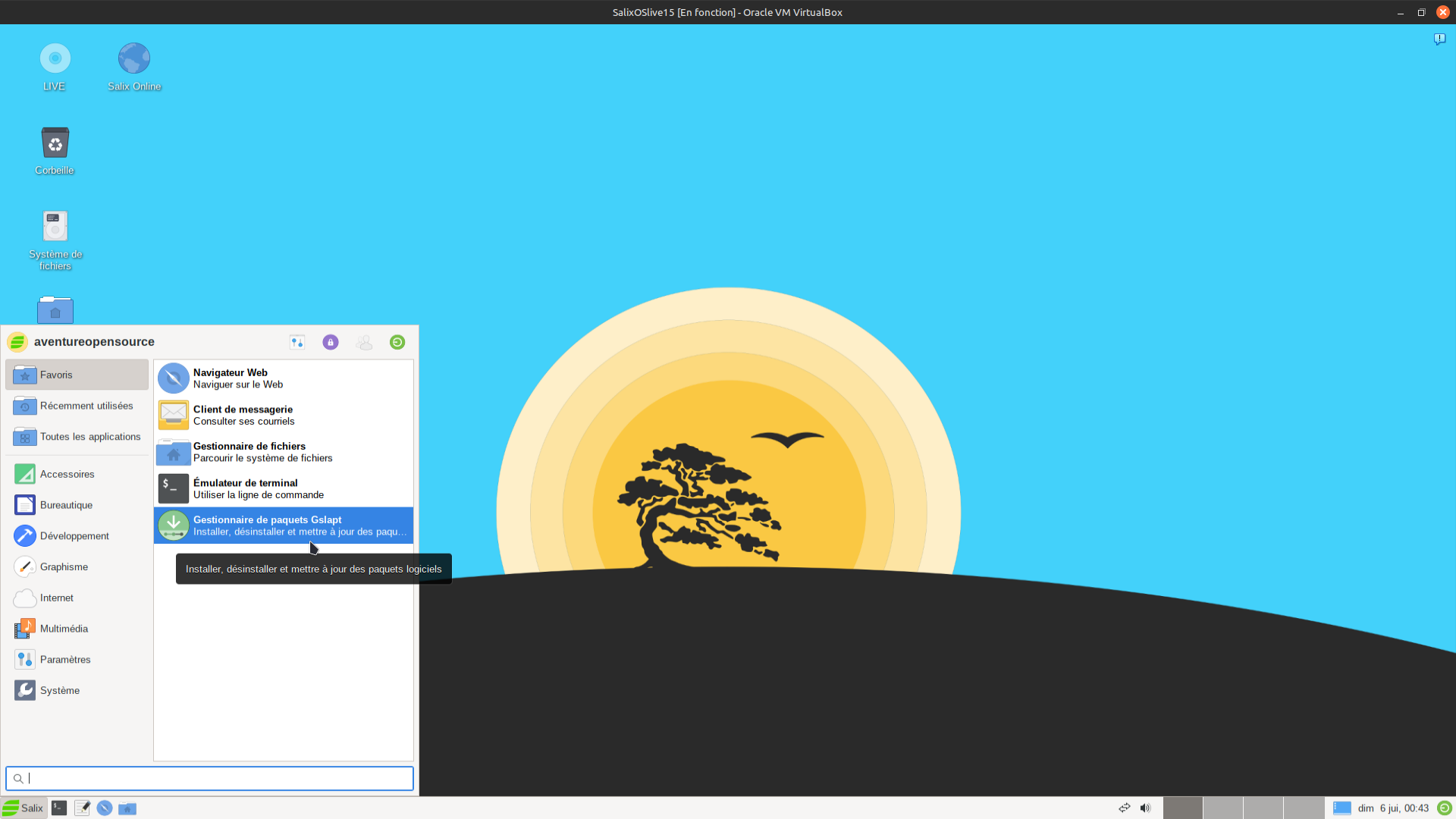 Faisons maintenant l'exercise d'installer une application avec Gslapt, dans un premier temps, il faut lancer Gslapt, pour ce faire allez dans le menu et allez sous l'onglet favoris ou système et sélectionner Gestionnaire de paquets Gslapt dans le choix du sous-menu.