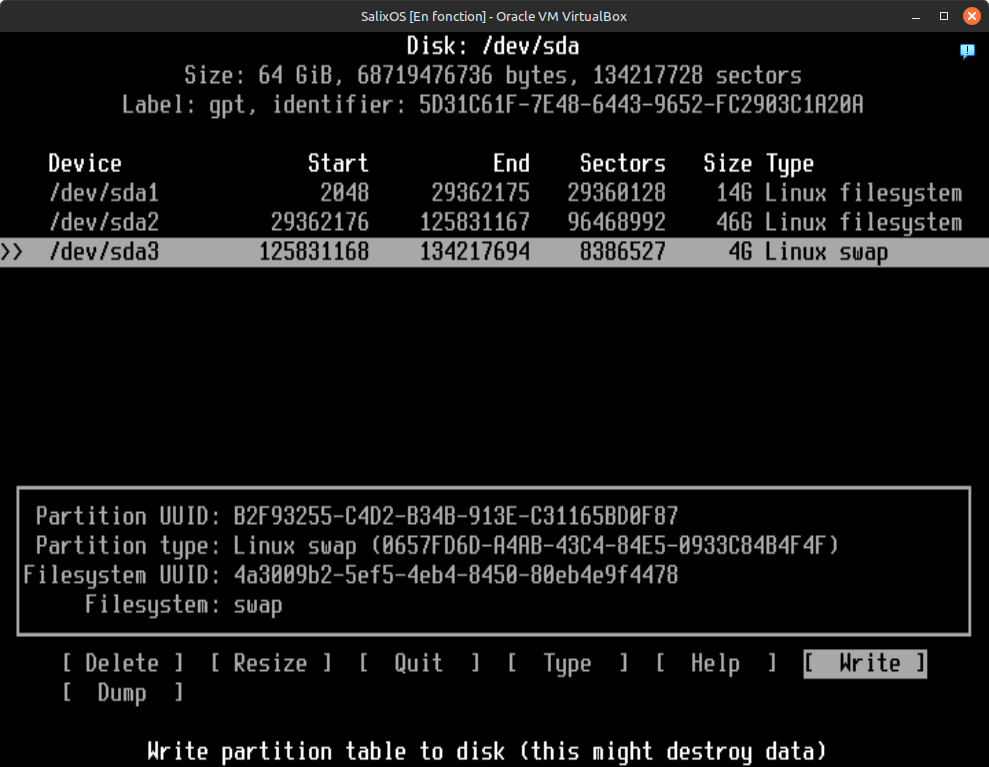14. Nous avons enfin terminé le partitionnement du disque dur.  Avant de quitter, vous devez écrire sur le disque vos partitions finales. Positionnnez vous sur "Write" et faite "enter" ensuite vous devez mentionner "yes" image 2 afin que le programme d’installation procède au formatage final. Une fois cette étape complétée, vous pouvez quitter en vous positionnant sur "Quit" image 3.