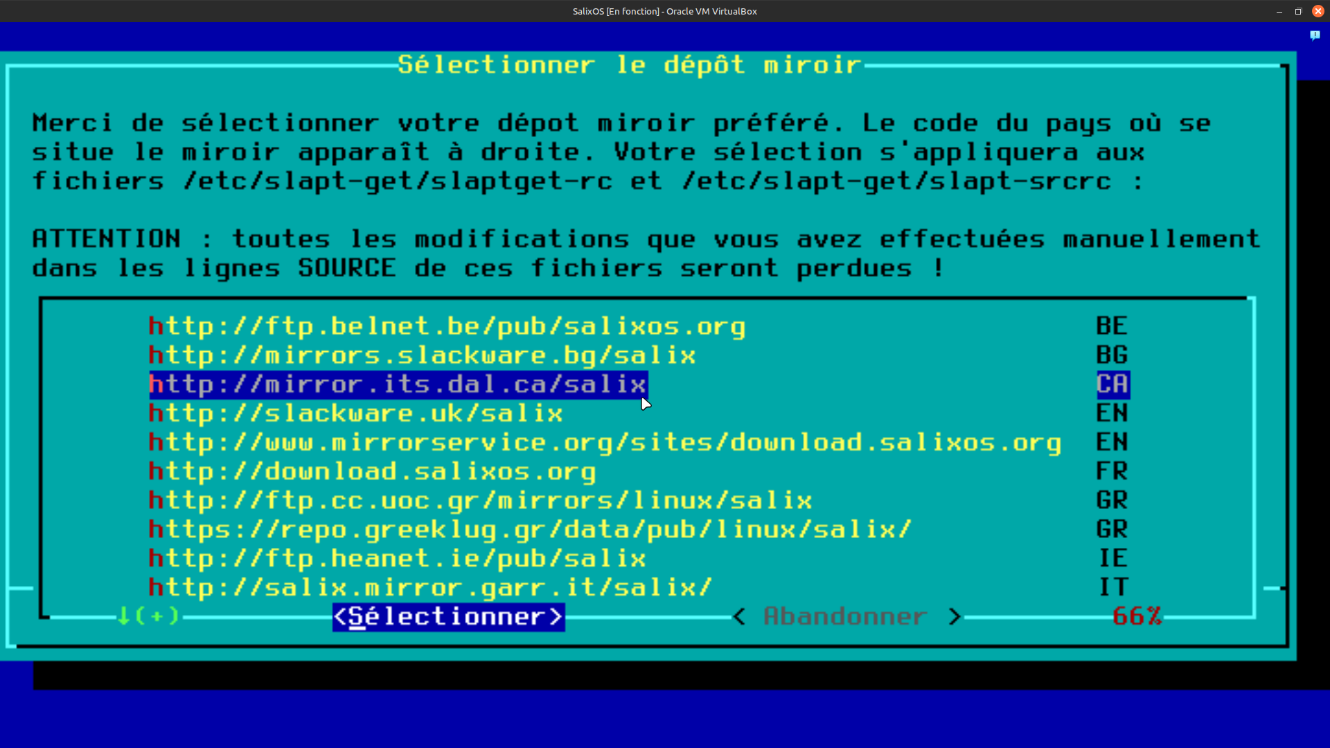 43. Vous voici à la fenêtre de dialogue de la sélection de votre dépôt. Le dépôt est l’endroit où sont téléversé tous les paquets système et logiciel. Dans le jargon Linux, nous appelons cela les sources. À l’aide des touches flèches du clavier, sélectionner le dépôt le plus près de votre demeure. Dans mon cas, c’est le dépôt héberger à l’université Dalousie qui fera office de ressource pour mon installation. Vous pouvez ultérieurement modifier le dépôt à votre convenance. Une fois fait, appuyer sur la touche "entrée" de votre clavier pour valider votre choix.