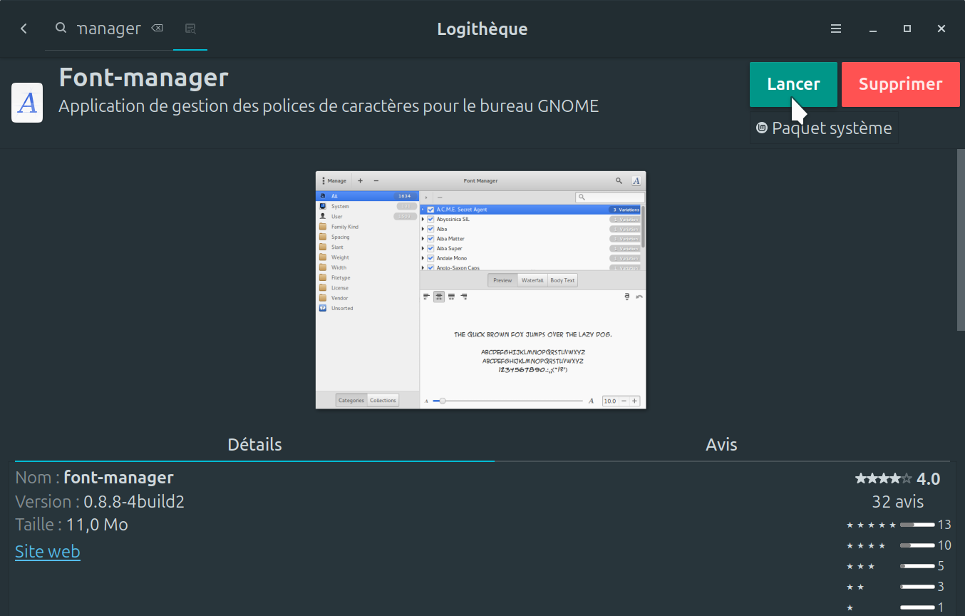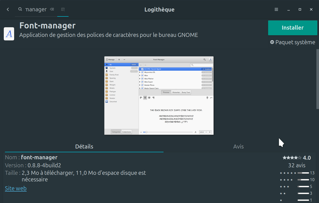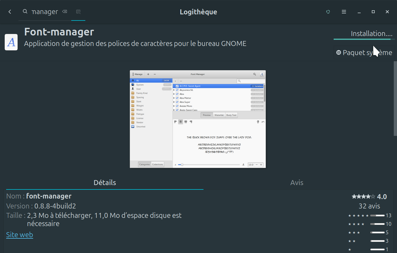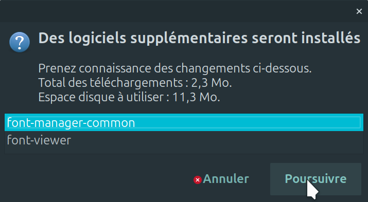 2. Une fois le logiciel Font-manager trouvé, vous avez simplement qu'à faire un clique sur installer. Lors de l'installation, une fenêtre supplémentaire apparaît afin de vous informer que des paquets supplémentaires seront installation. Juste à faire un clique sur * Poursuivre *. Une fois fait, le processus d'installation est en route (image3).
