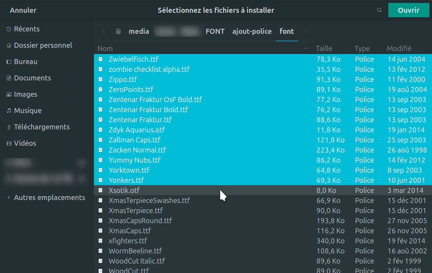 5.1 Une fois fait, une autre fenêtre s'ouvre et vous permet d'aller sélectionner vos polices à ajouter. Vous pouvez en sélectionner plusieurs comme sur l'image ci-dessous. Lorsque votre sélection est terminée, faite un clique sur * Ouvrir *.